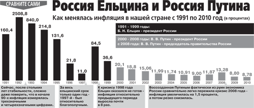 Повторив по сути знаменитые слова Столыпина («Дайте государству 20 лет покоя внутреннего и внешнего - и вы не узнаете нынешней России»), Путин в очередной раз позиционировал себя как умеренно консервативного политика. Самое важное для него, как и для абсолютного большинства россиян, - сохранение стабильности в стране. В этом и секрет невероятной популярности Владимира Владимировича на протяжении долгих лет. Сравнивая времена правления Ельцина и Путина, народ понимает, что 1990-е и 2000-е разительно отличаются. Какой показатель успешности страны ни возьми - рождаемость, смертность, инфляцию (см. график внизу страницы), - Путин выигрывает.